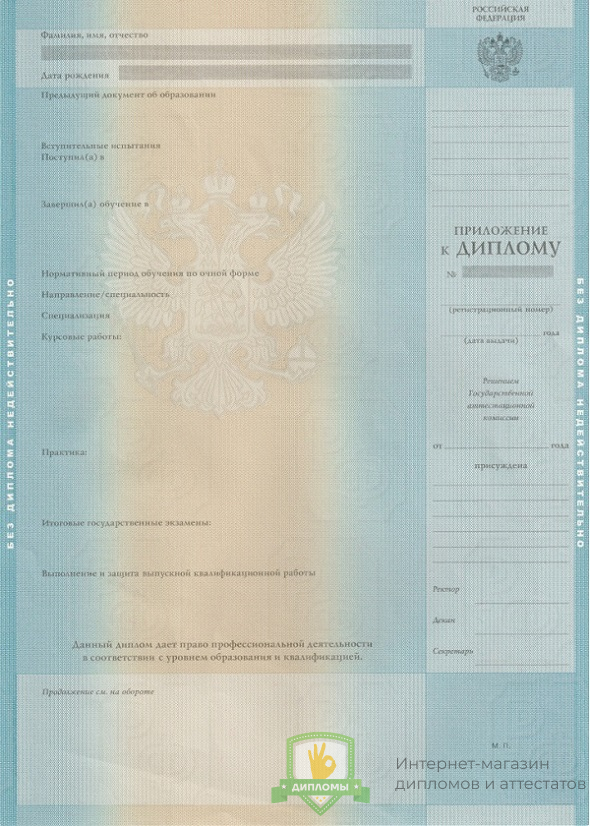 Изготовленный документ в компании «ОК-Дипломы» оформлен согласно действующим в Российской Федерации законам, соответствует нормам и особенностями, присущим тому или иному учебному заведению, имеет все элементы защиты.